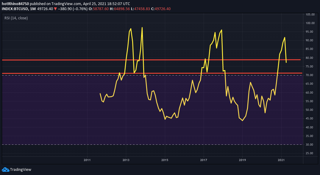 If we go to the monthly chart of Bitcoin and plot the RSI, we notice a similar pattern across market cycles. The pattern being that the RSI tends to peak twice in the range of 95-97.
