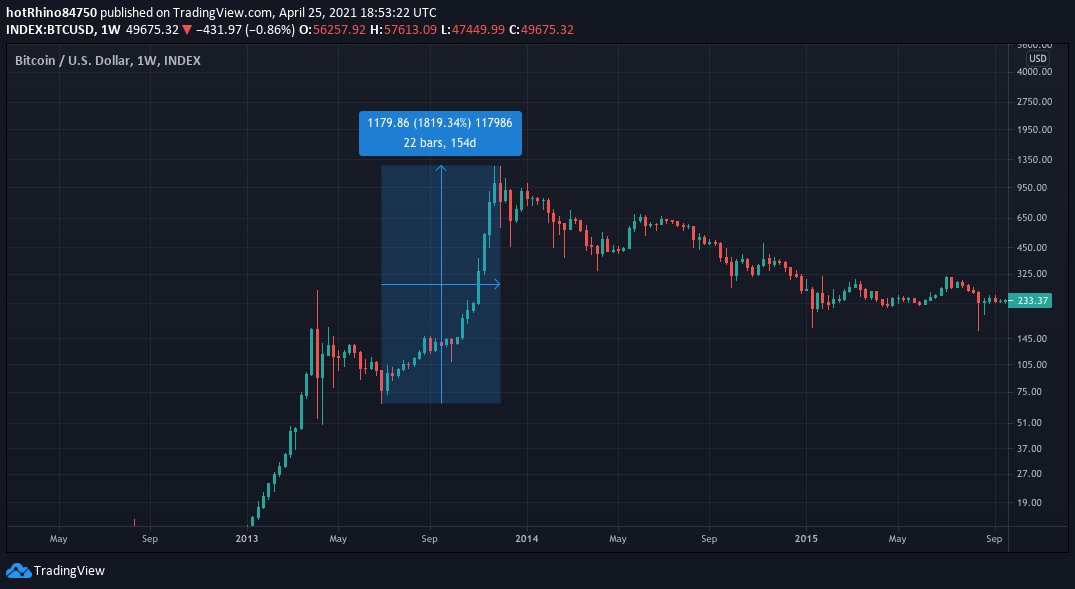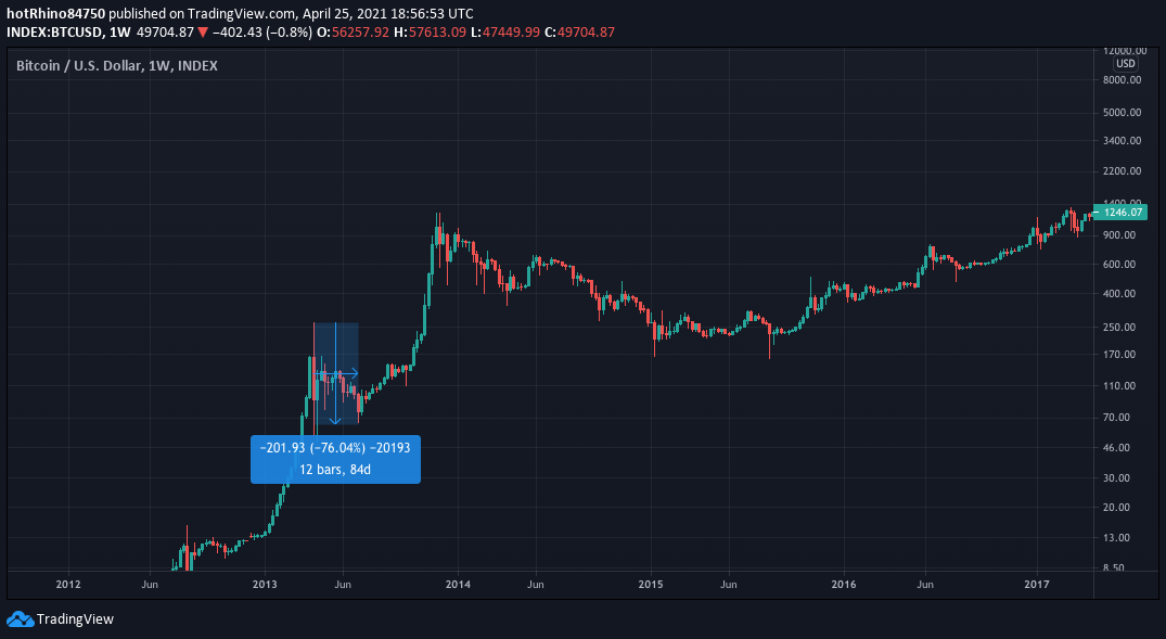 In 2013, Bitcoin made a local high of $270 in the week of April 15, 2013. From this top, Bitcoin corrected by almost 76% to touch a low of $65.