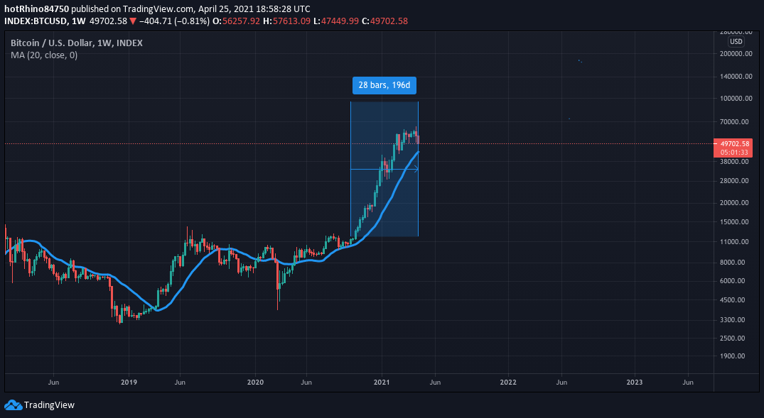 In the current market cycle, we last tested the 20 week simple moving average back on the week of October 5, 2020. So, its been around 196 days that we have tested the 20 week simple moving average.